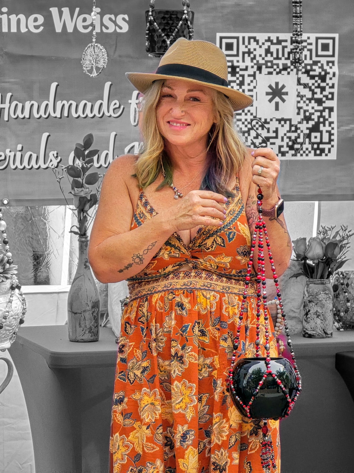 I create one-of-a-kind art by transforming wine bottles into wind chimes, vintage jewelry transformed into plant hangers, sun catchers, skatelets, trees of life and more. Each piece is one-of-a-kind, carrying a story of transformation, resilience, and community kindness.