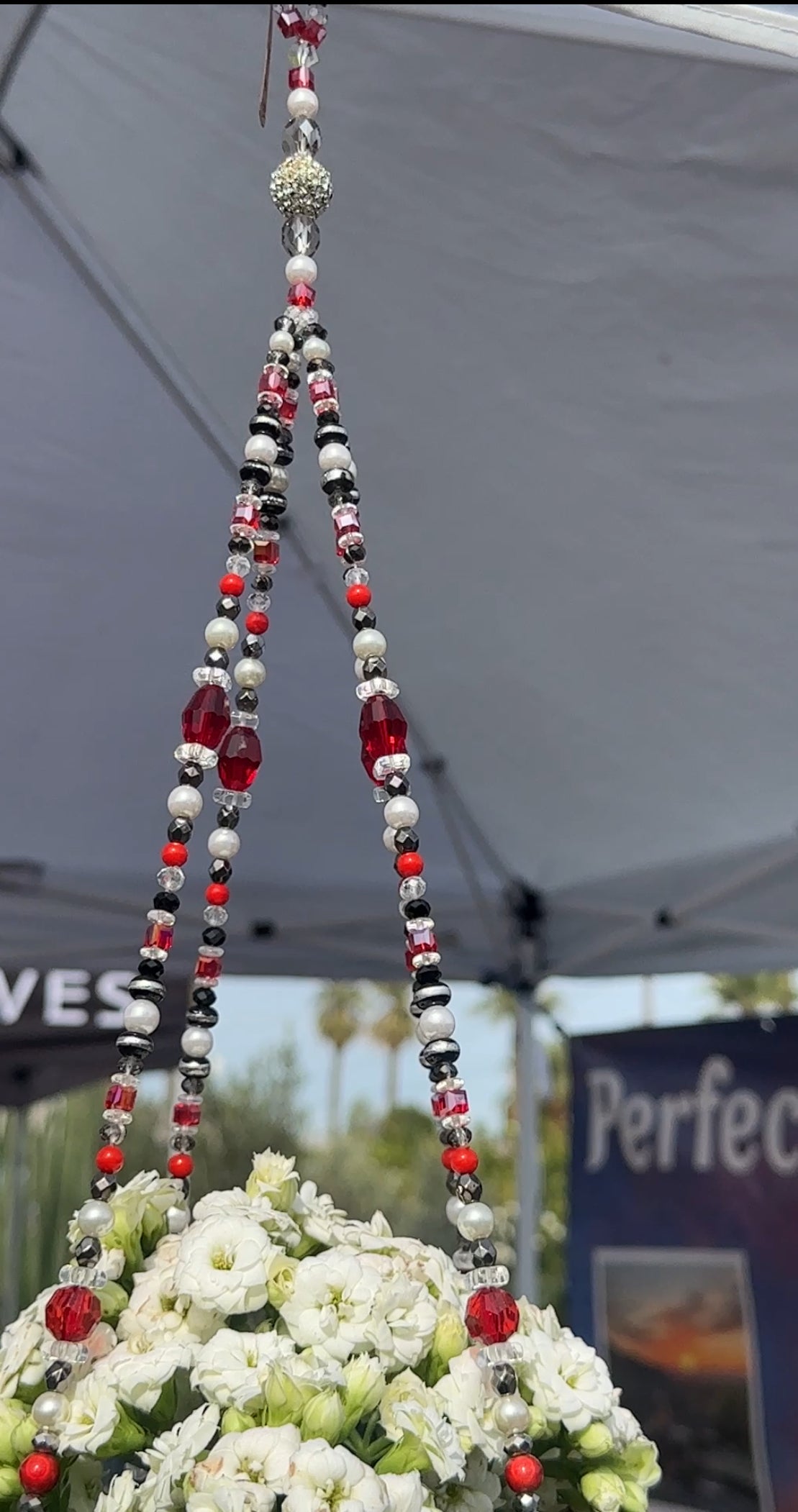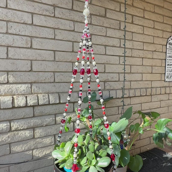 âDisney Dreamingâ  brings a touch of classic magic with its striking red, black, and white color schemeâan unmistakable nod to a beloved icon. Handcrafted using upcycled beads from thrifted necklaces, itâs a sustainable and stylish way to showcase your plants. The shimmering pearls, sparkling rhinestone accents, and bold pops of red create an enchanting contrast, while the intricate beadwork adds depth and charm. Whether youâre a Disney fan or simply love elegant, eye-catching decor, this one-of-a-kind piece is sure to make your space feel extra special.