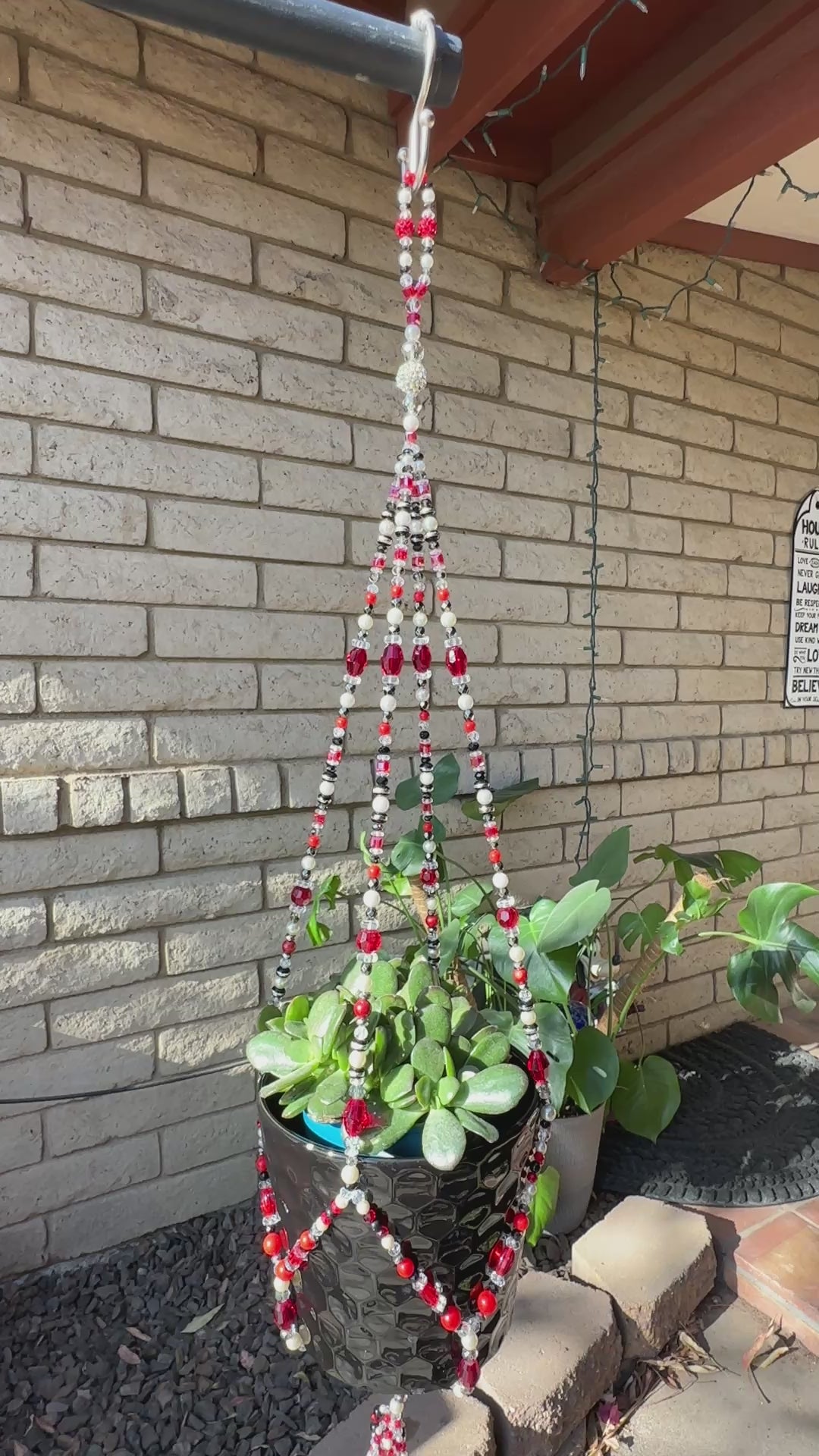 This Handmade beaded plant hanger can be hung from a ceiling hook, wall mount, or on a curtain rod right in your window.