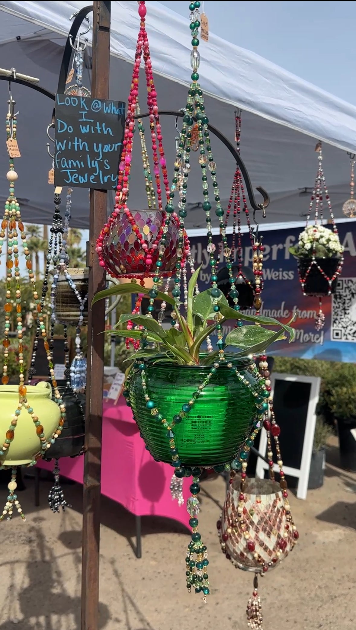 A piece reborn, a goddess awakened—“Emerald Goddess” breathes new life into repurposed jewelry, transforming forgotten treasures into an elegant sanctuary for your plants. Deep emerald and swirling jade beads intertwine with golden and crystal accents, shimmering like sunlight filtering through a lush forest. Each bead, once adorning necklaces and bracelets, now tells a new story of renewal and artistry.