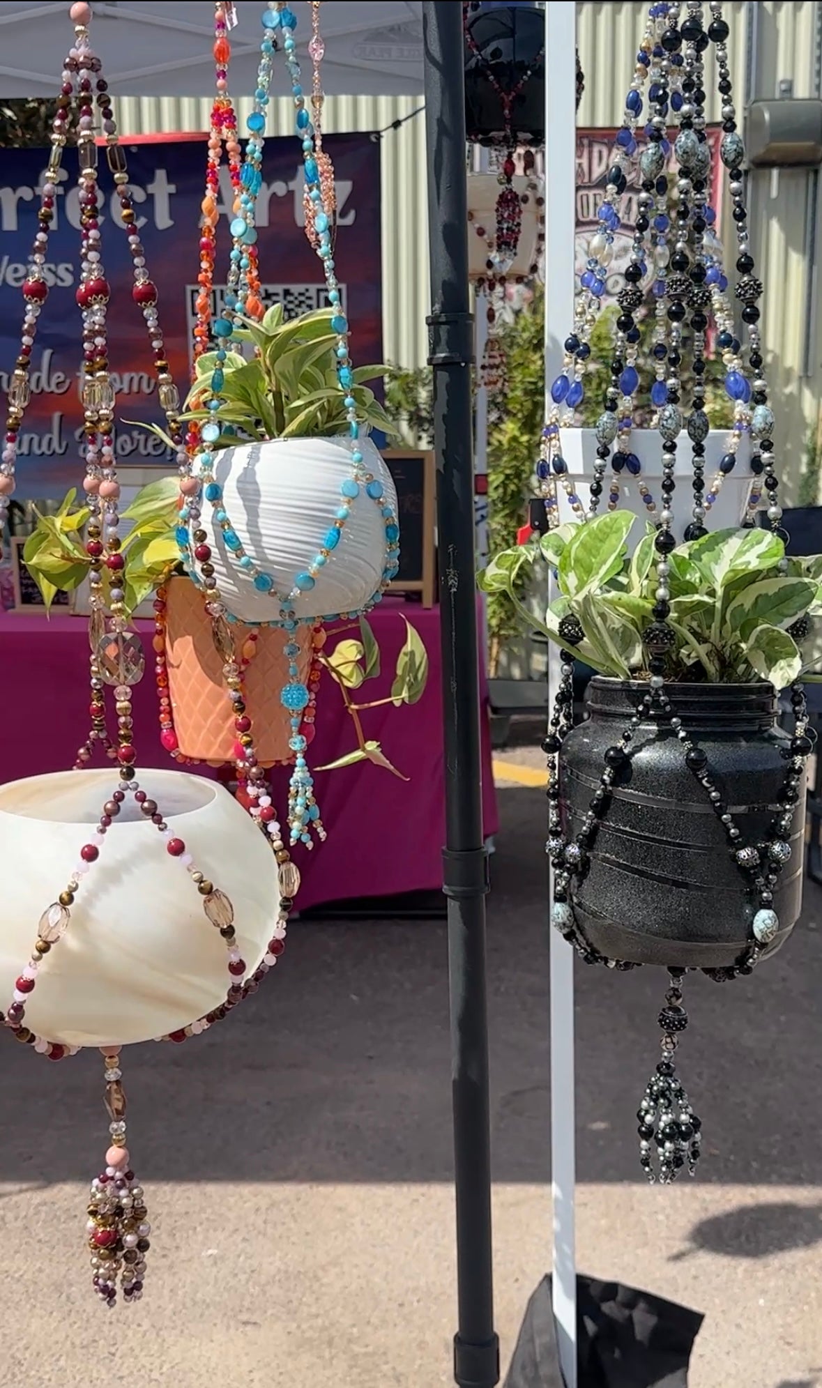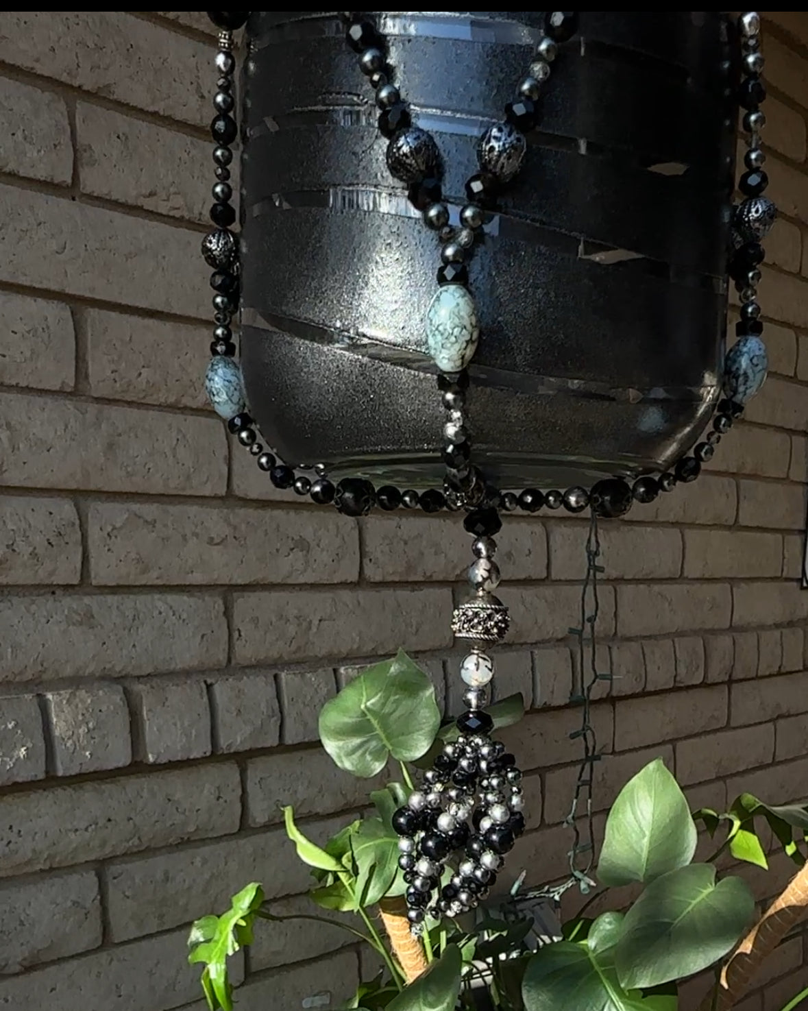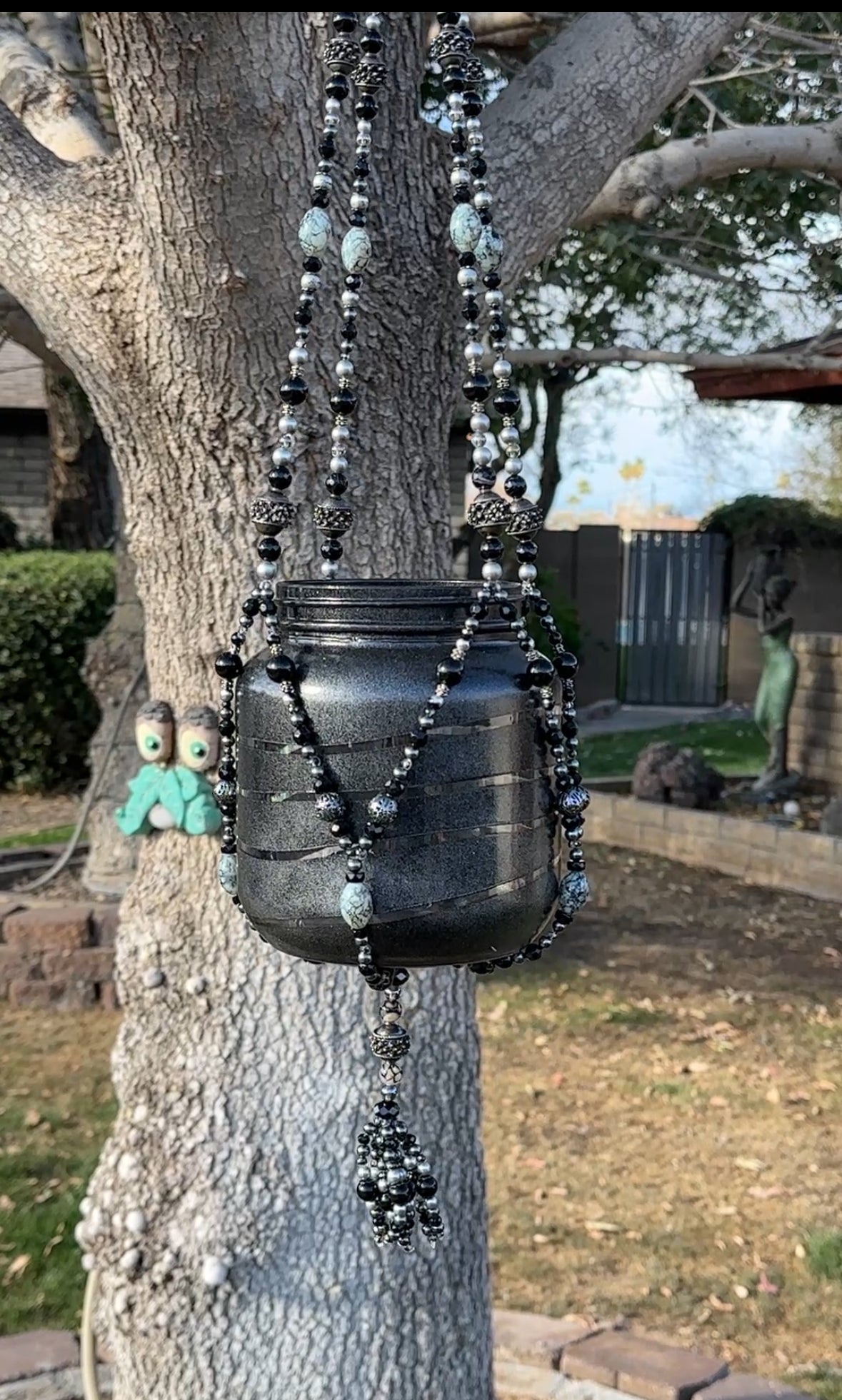 A relic of a forgotten kingdom, “Medieval Times” is a beaded tapestry of strength and elegance. Upcycled black and silver beads, salvaged from thrifted jewelry, drape like the armor of a noble knight, while intricate metal cages with spiked details whisper of castles, secrets, and moonlit battles. The pot—a once-humble pickle jar—has been reborn in a gleaming coat of metallic black, standing as a vessel fit for a royal garden. A fusion of history and artistry, this piece transforms any plant into a centerpiece of legend.