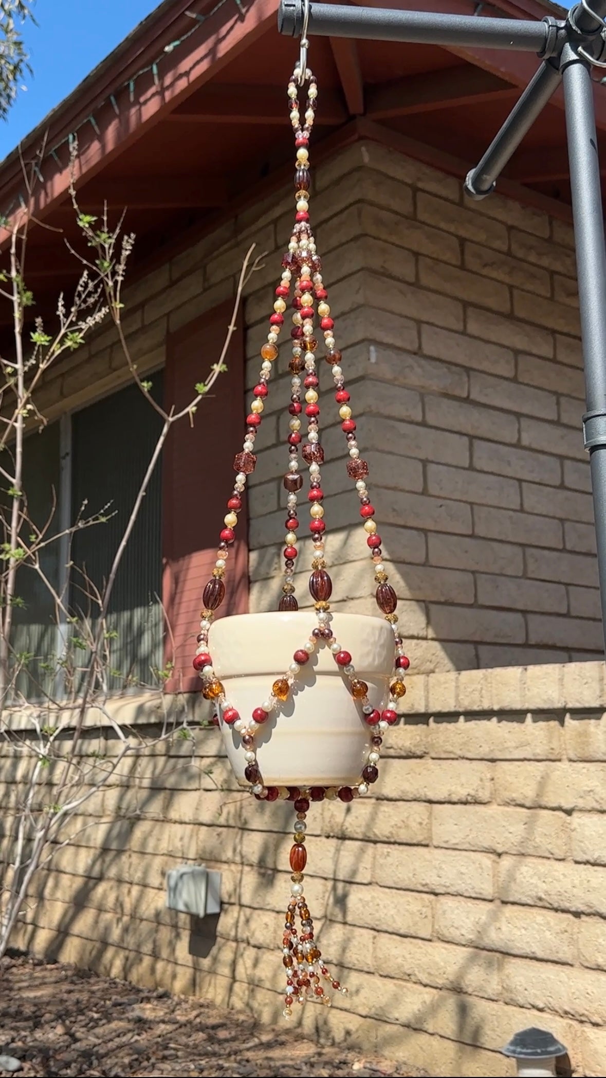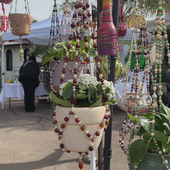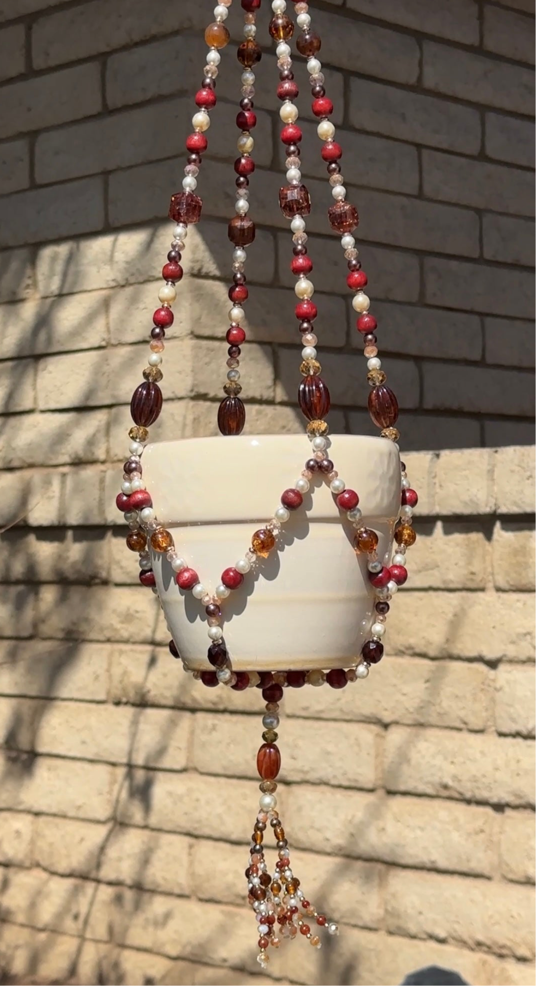“Meet Me in the 70’s” is a vibrant nod to the bold and earthy tones of the disco era. This beaded plant hanger features a rich mix of warm reds, deep ambers, and creamy pearl accents, creating a nostalgic yet timeless aesthetic. The combination of glass, wood, and pearl-like beads—once part of vintage necklaces and bracelets—adds depth and character to the design. Whether it’s catching the sunlight on a patio or adding a retro touch to an indoor space, this piece brings a perfect blend of bohemian charm and vintage flair.