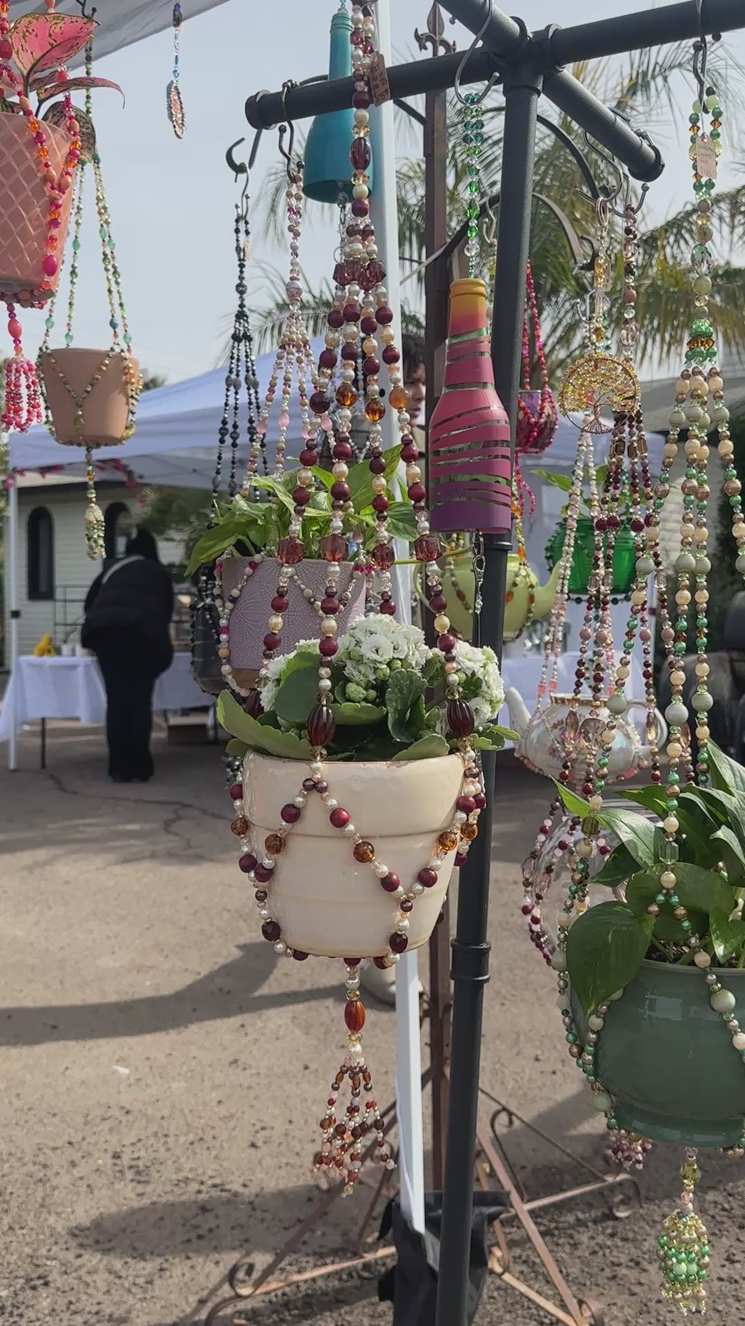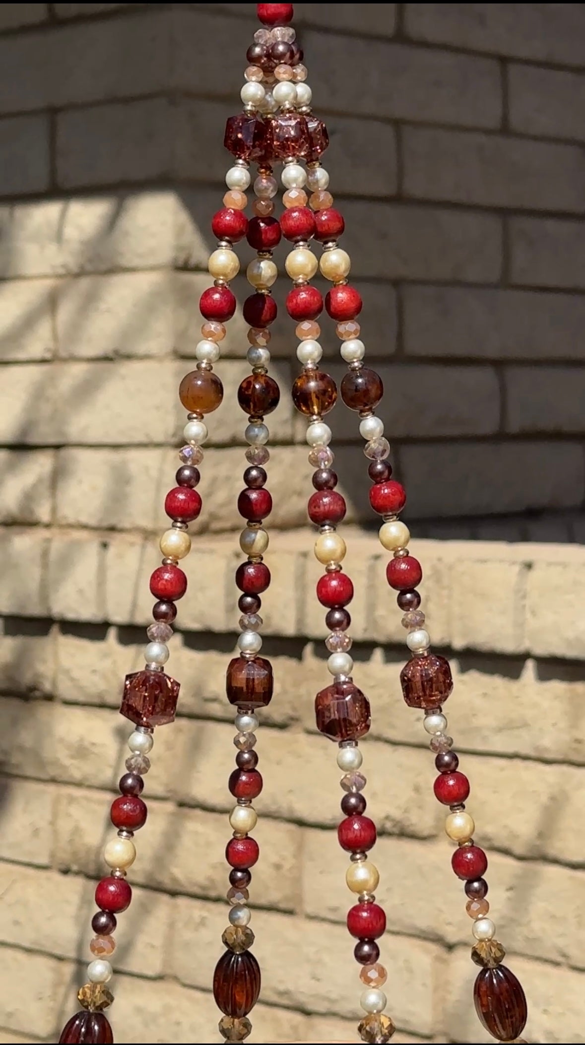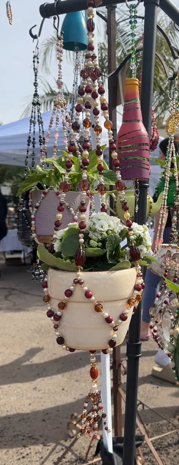 “Meet Me in the 70’s” is a vibrant nod to the bold and earthy tones of the disco era. This beaded plant hanger features a rich mix of warm reds, deep ambers, and creamy pearl accents, creating a nostalgic yet timeless aesthetic. The combination of glass, wood, and pearl-like beads—once part of vintage necklaces and bracelets—adds depth and character to the design. Whether it’s catching the sunlight on a patio or adding a retro touch to an indoor space, this piece brings a perfect blend of bohemian charm and vintage flair.