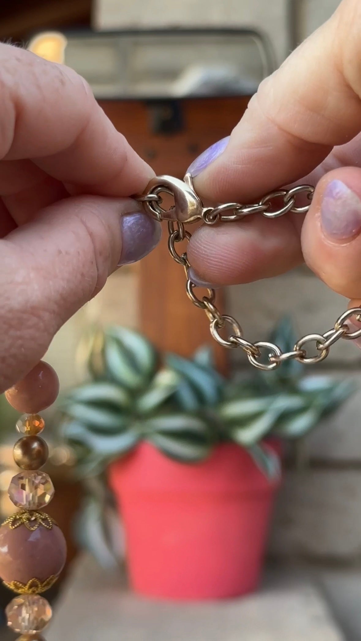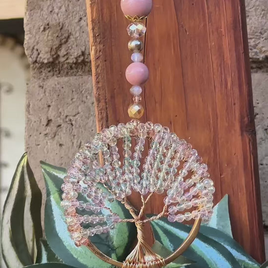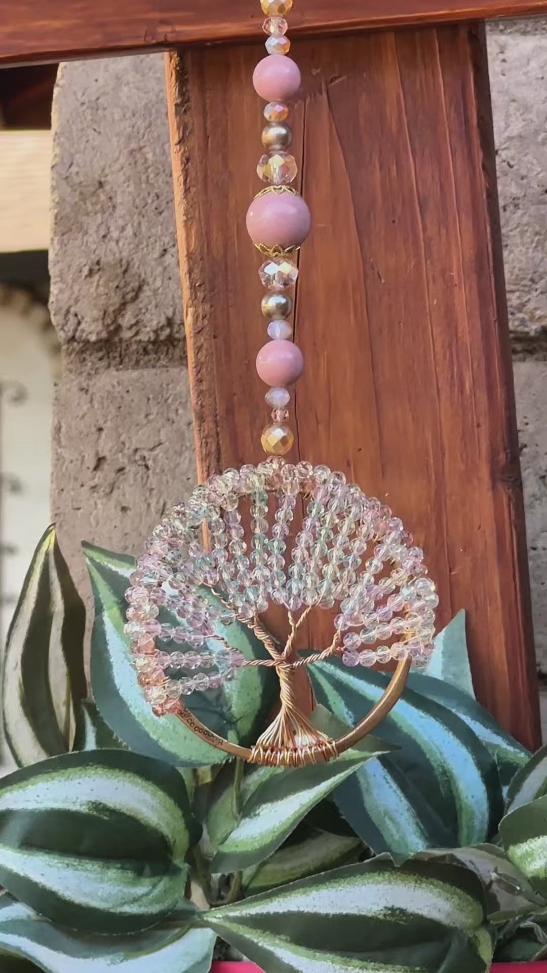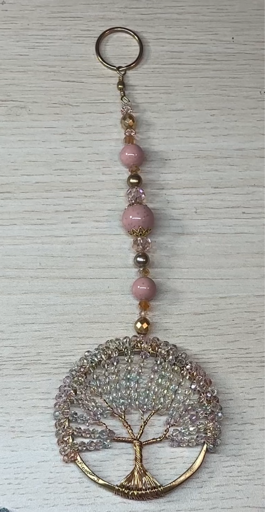 Spring Bling began its journey as a bold vintage necklace, its golden rings now reborn as the frame for this hand-wired Tree of Life. Carefully wrapped with shimmering pink, blush, and champagne-hued beads, each branch sparkles like sunlight on spring blossoms.