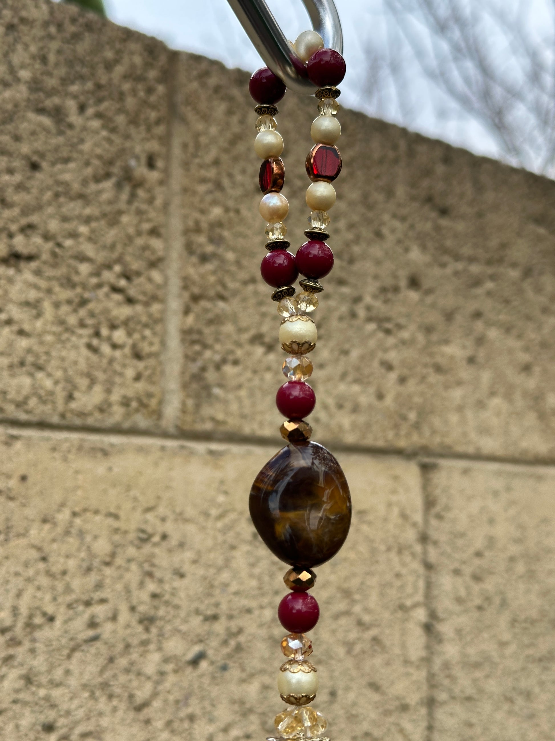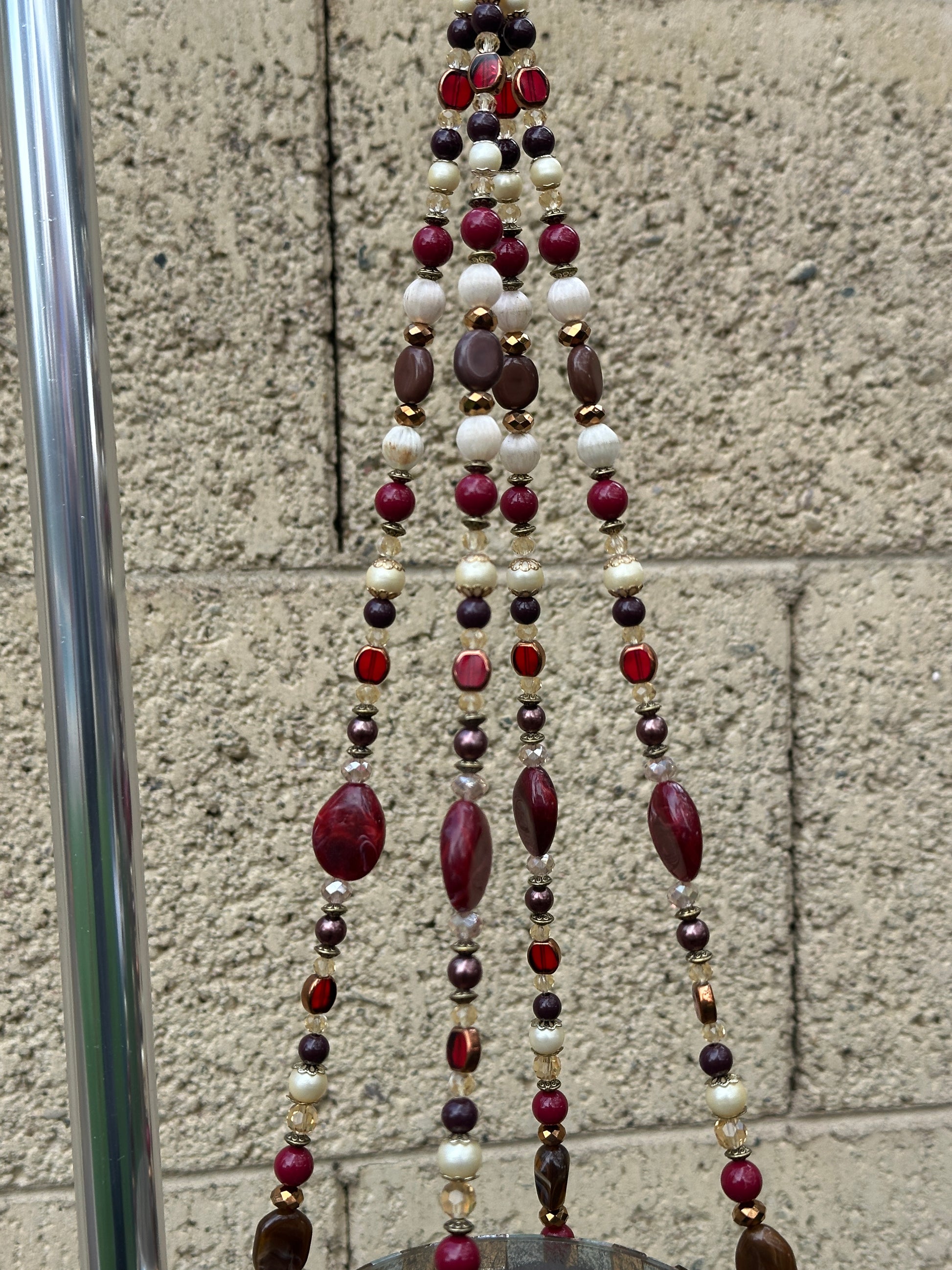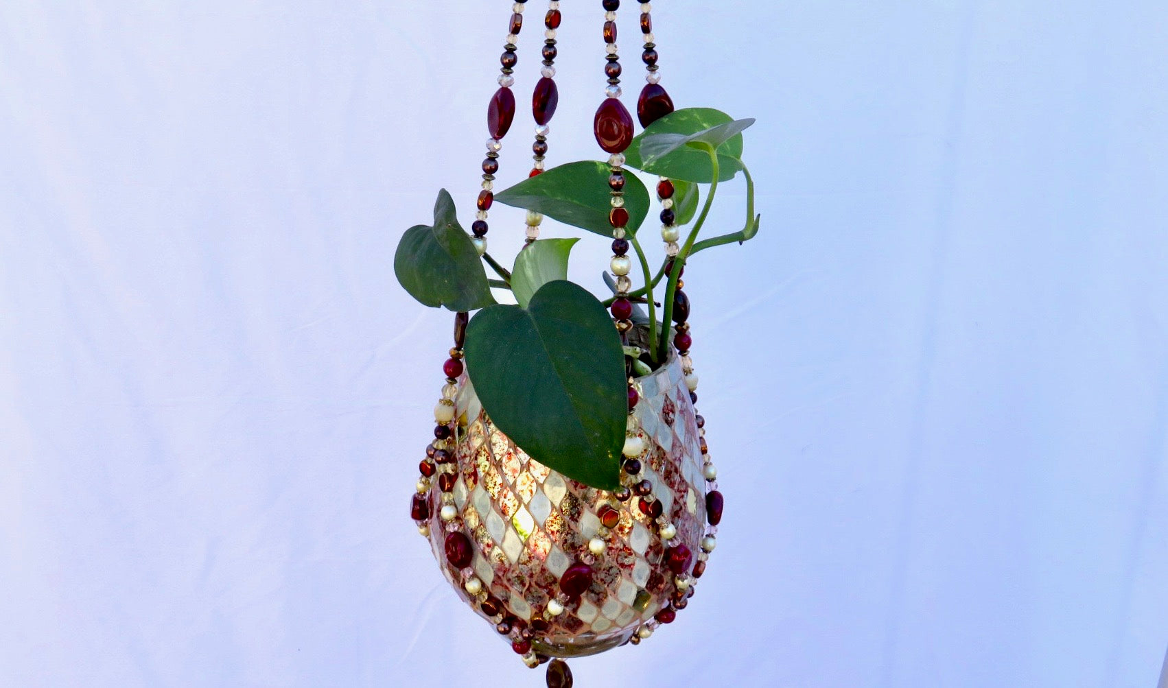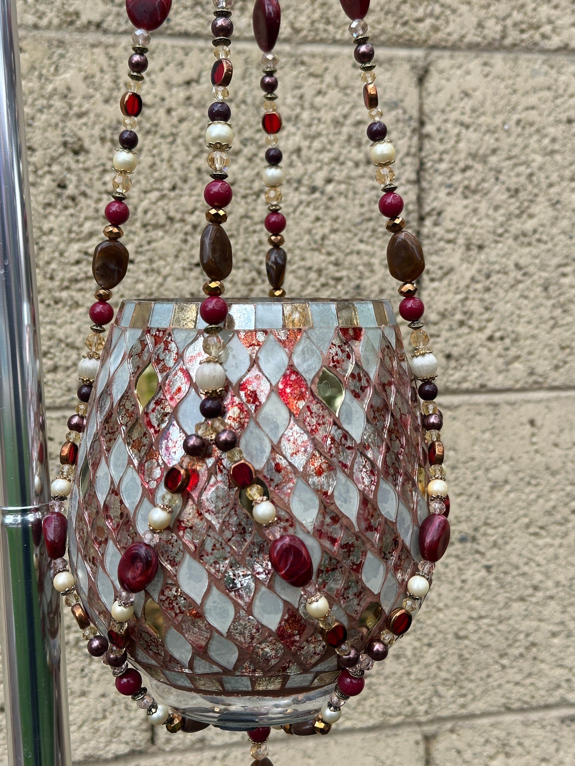 Rich with vintage charm, Treasure Chest evokes the mystery and elegance of long-lost jewels. Crafted from repurposed necklaces, its deep amber, pearl, and ruby-red beads shimmer like precious gems, while gold accents add a touch of old-world luxury. The intricate beading cascades beautifully, cradling a mosaic glass vessel that catches the light like buried treasure rediscovered. A striking blend of warmth and opulence, this piece is perfect for adding a bit of timeless beauty to any space.