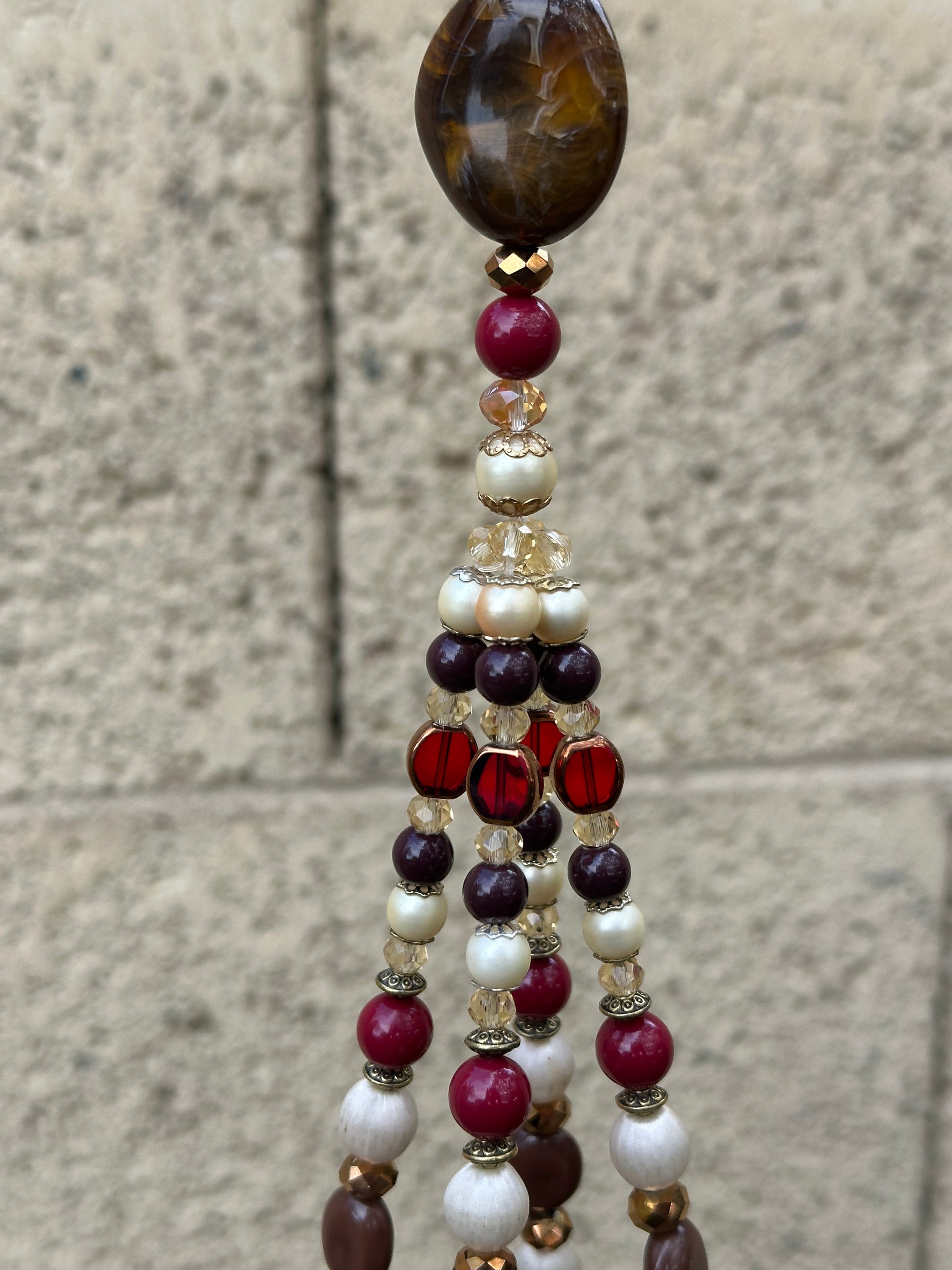 Materials: Tiger’s Eye, Czech glass, crystal glass beads, pearls, stones, ceramic and acrylic, woven pearls, gold accents